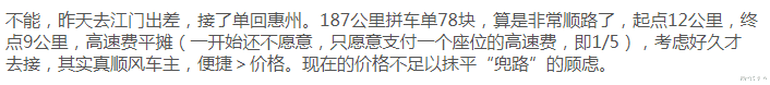 现在顺风车的价,说出来你可能都不信。到车主手里拼车每公里就2毛钱,独享七八毛,电费都要涨到三块一度了,这还不够电动车充电的呢。在珠三角那边,跨城跑一百公里才 30 块的单子也不稀奇。这价钱,早就偏离正常跑一趟该有的成本了。